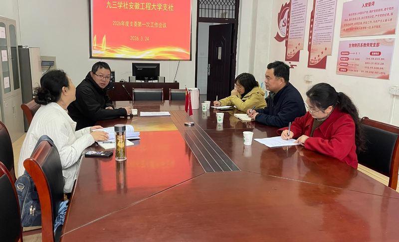 本网讯 3月24日,九三学社安徽工程大学支社组织召开2026年度支委第一次工作会议,总结2025年工作,部署2026年工作任务。会议由支社主委王洲主持,第八届支委会全体委员参加。